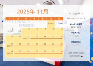 2025.10.31 お知らせ 休館のお知らせ みなさまこんにちは☀️ 下記期間はスクール休館日となりますので、ご確認ください。 休館日 2025/11/2(日)~11/4(火) 上記期間中のお問い合わせにつきましては、11/5(水)以降順次ご対応いたします。 ご迷惑をおかけしますが、何卒、よろしくお願いいたします。 NEOSPORTSKIDS 富士河口湖校