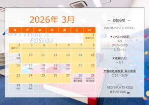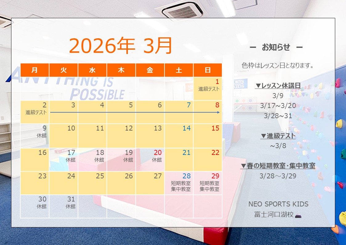 2026.02.07 お知らせ 3月カレンダー公開🎎 みなさまこんにちは☀️ NEO SPORTS KIDS 富士河口湖校です🗻 花粉なのか黄砂なのか、、、粉っぽさを感じます🤧 さて、3月のカレンダーを公開します📅 色塗り部分がレッスン開講日になります🤸⭐ ▷イベント情報 〇春の集中教室 ・2026/3/28~3/29 〇春の短期教室 ・A日程:2026/3/28~3/29 ・B日程:2026/4/4~4/5 年度末の3月!進級する前に1つでも少しでもレベルアップしましょう🔥