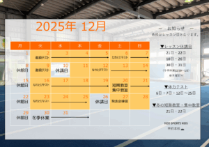 2025.11.06 お知らせスケジュール 11月カレンダー 12月のカレンダーを更新しました! ↑↑タップして拡大↑↑ 休講日 12/10、26 12/30~1/3(冬季休業) 短期教室 12/20~21 ※通常レッスンはお休みです 進級テスト 11/5~12/5 なわとびテスト 12/6,7、12/12~25