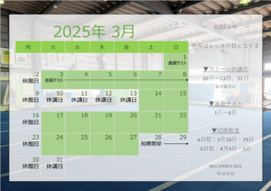 2026.02.05 お知らせスケジュール 3月カレンダー📅 3月のカレンダーを更新しました! ↑↑タップして拡大↑↑ 休講日 3/10、11、12、13、31 短期教室 A日程:3/28、29 B日程:4/4、5 進級テスト 2/17~3/8