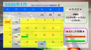 2025.12.05 お知らせコラム 1月スケジュール❄️🎍⛩ 休館情報 ●定休日(月) ●1/29(木) ●12/29(月)~ 1/3(土) ※休館日の振替は必要ございません。 イベント情報 ✅ 体力テスト:12/20(土)〜1/17(土) ✅ なわとびテスト:1/20(火)〜2/12(木) 寒さに負けず、元気に体を動かして、心も体もぽかぽかにしていきましょう!🔥💪✨ 1月は体力テストとなわとびテストを実施します! 自分の成長を実感できるチャンスに、子どもたちもドキドキわくわく🎵 「できた!」の喜びを一緒に味わいましょう!🌟 NEO SPORTS KIDS沖縄豊崎校🌺