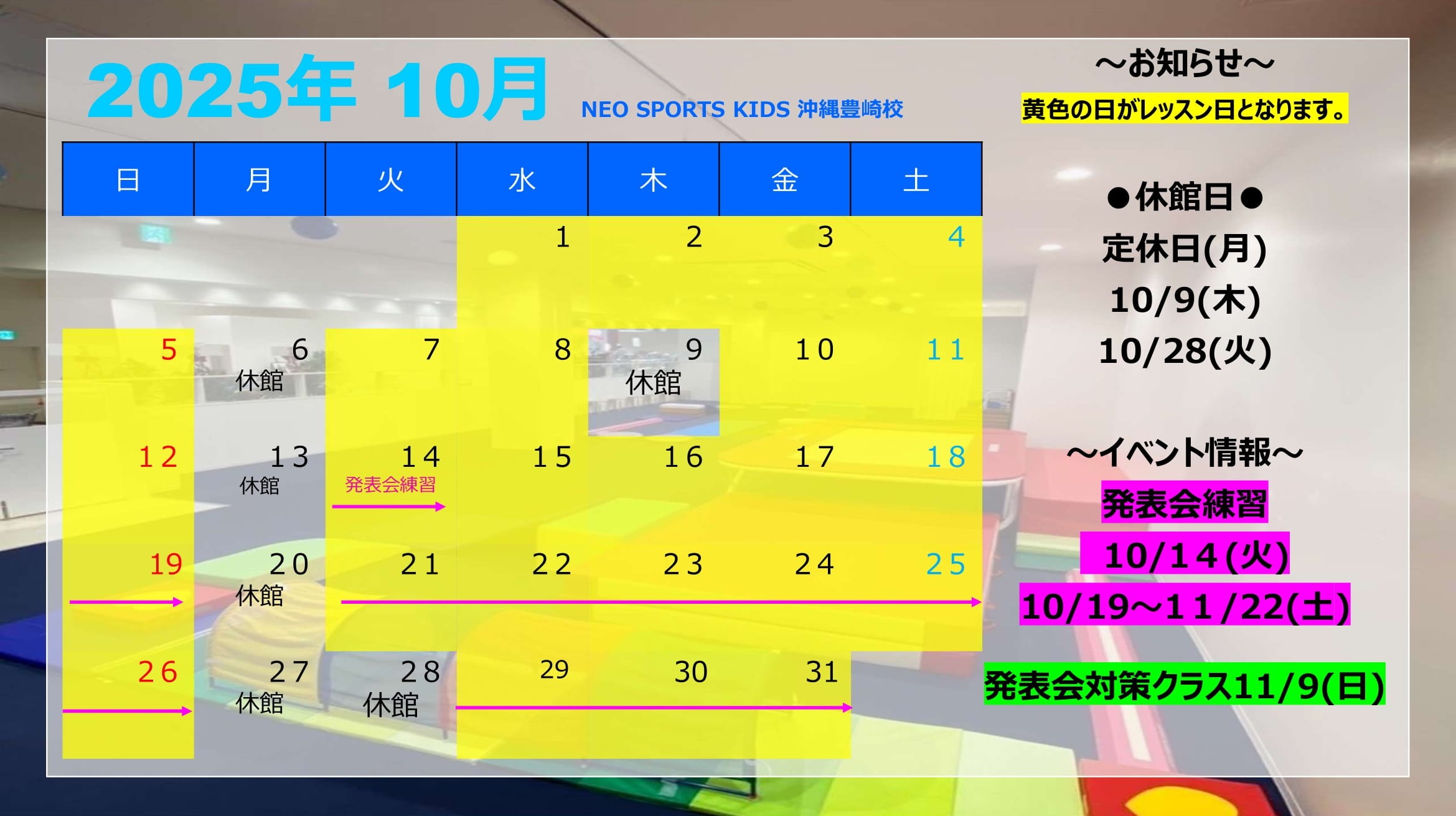 2025.09.05 お知らせ 10月スケジュール🎃🍁👻 休館情報 ●定休日(月) ●10/9(木) ●10/28(火) ※休館日の振替は必要ございません。 イベント情報 発表会練習 ●10/14(火) ●10/19(日)~11/22(土) 発表会に向けての練習が始まります💪 ドキドキ!ワクワク!年に一度の発表会✨✨ NEO SPORTS KIDS沖縄豊崎校🌺