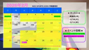 2026.01.22 お知らせ 2月スケジュール 👹🌸🍫 休館情報 ●定休日(月) ● 2/10(火) ● 2/11(水) ※休館日の振替は必要ございません。 イベント情報 ✅ なわとびテスト:1/20(火)〜2/12(木) ✅ 進級テスト:2/24(火)〜3/15(日) なわとびテストもいよいよ終盤。 「あともう少し!」「前よりできた!」と、子どもたちの成長が毎回キラキラ輝いています🌟 進級テストに向けて、基礎体力や動きづくりも丁寧にサポートしていきますのでご安心ください。 寒さが続きますが、体を動かすと心も体もぽかぽかに。 2月も一緒に楽しくチャレンジしていきましょう!💪🔥✨ NEO SPORTS KIDS沖縄豊崎校🌺