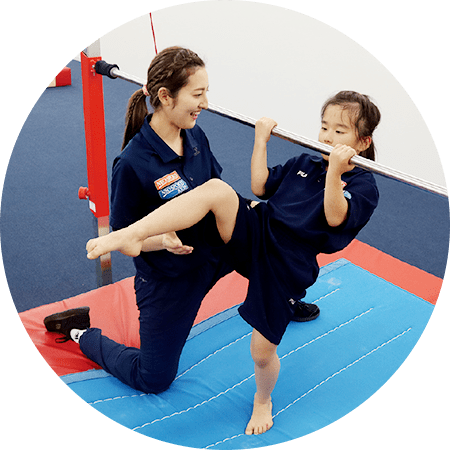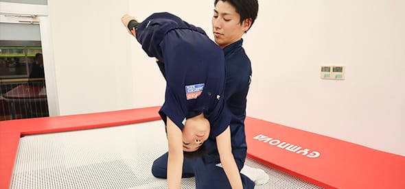 ブリッジやジャンプ、倒立などの基礎から練習して、トランポリンなどの専門器具を使ってバク転の習得を目指します!